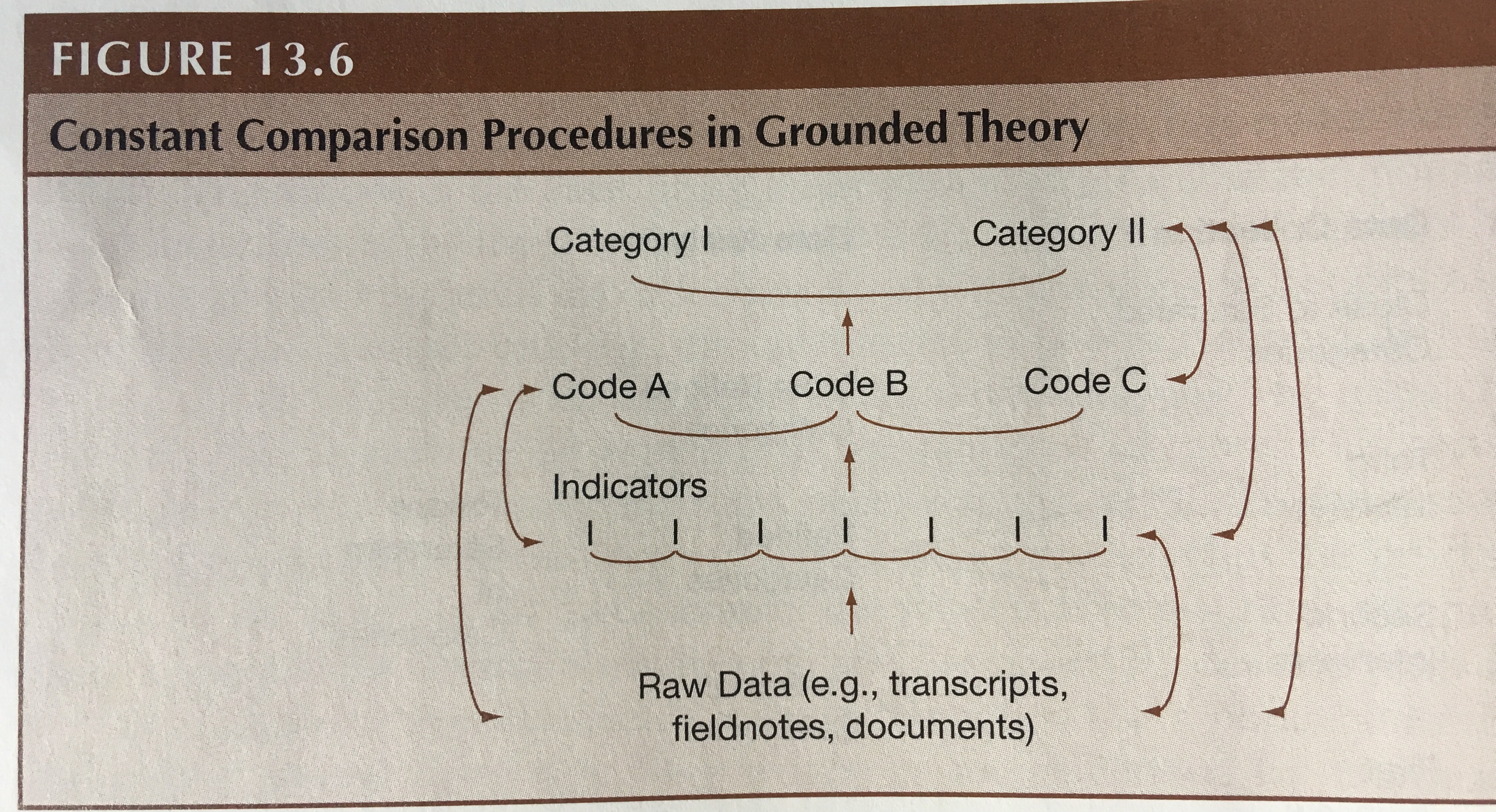 It usually starts with the identification of open coding categories and using the constant comparative analysis for saturation by comparing data and categories. Based on open coding, the researcher moves to axial coding and generates a coding paradigm, while causal conditions, intervening and contextual categories, strategies, and consequences are identified.